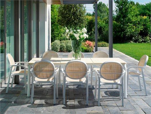 Коллекция Gemma включает штабелируемые кресла из полипропилена и синтетической ткани, что обеспечивает высокую воздухопроницаемость и комфорт. Столы Lauro из алюминия и полипропилена с порошковым покрытием отлично подходят для использования как внутри, так и на улице.