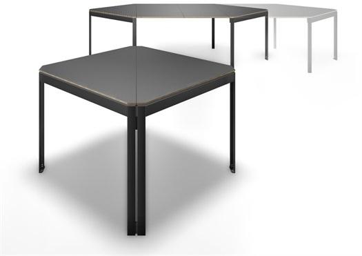 Стол Armonico использует запатентованную систему телескопических направляющих, позволяющую расширять его из квадратной формы в шестиугольную.