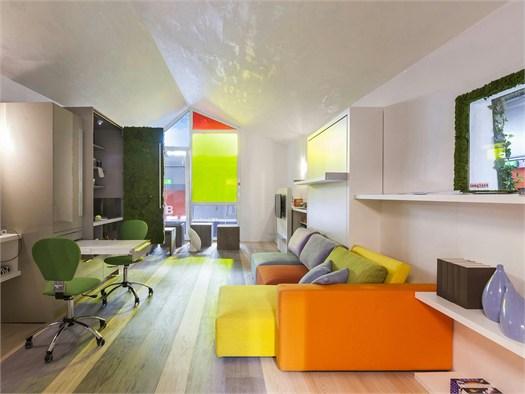 Среди представленных решений — гостиная с диваном Swing, который трансформируется в двуспальную кровать, и система Poppi Theater, включающая раскладную кровать и книжный шкаф с выдвижной панелью для телевизора.