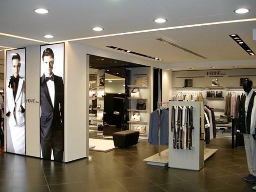 В выставочном зале Ferrè использованы материалы, такие как кожа, стекло и лакированное дерево, которые подчеркивают уникальность представленной продукции.