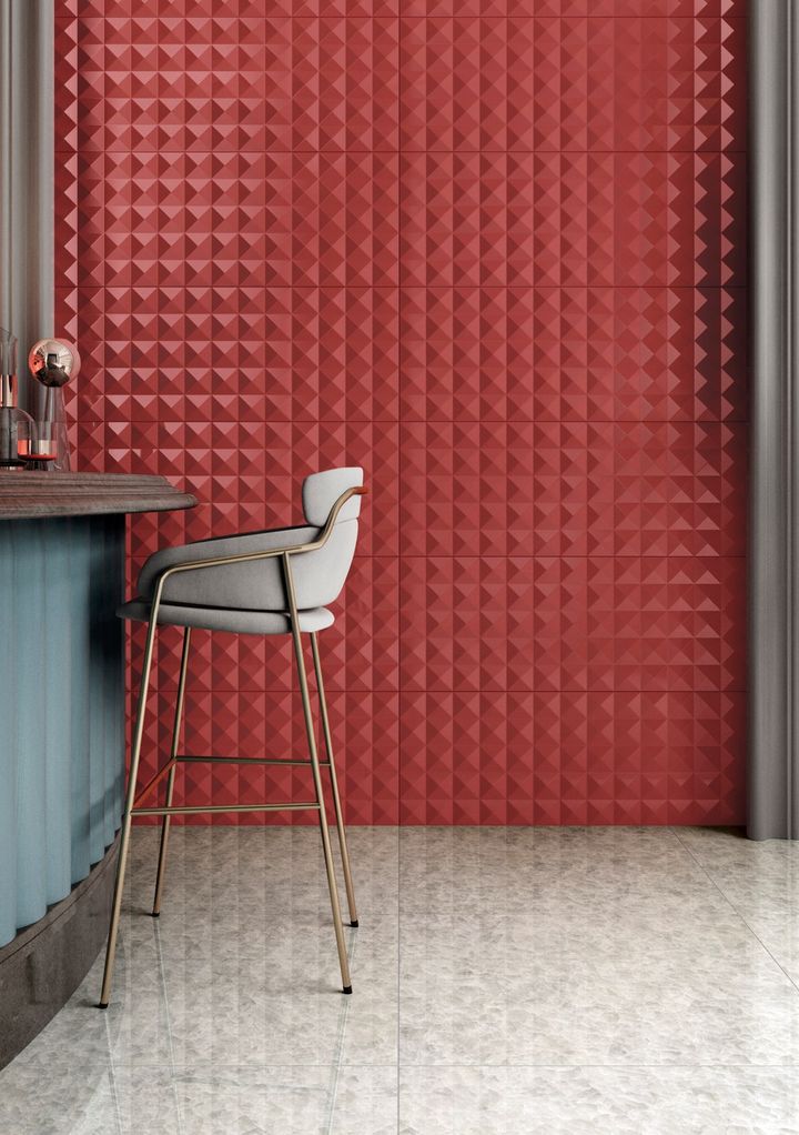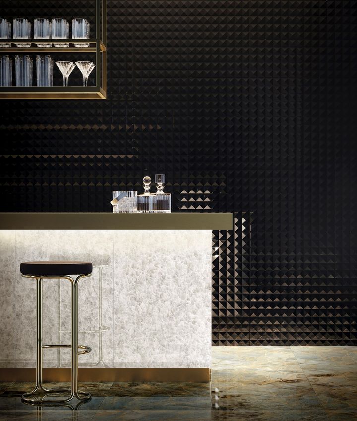 Коллекция Opulence вдохновлена текстурами драгоценных гранитов и включает в себя плитку с глянцевыми и матовыми эффектами, а также объемные настенные конструкции.