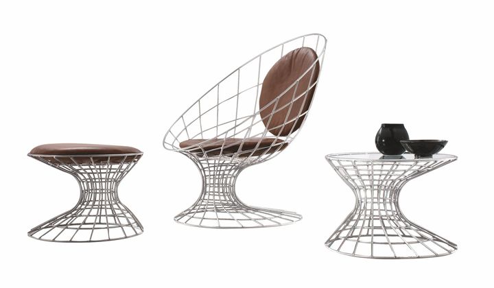 Включает кресла, столики и пуфы из плетёного металла. Доступны в различных цветах и подходят как для интерьера, так и для уличного использования.