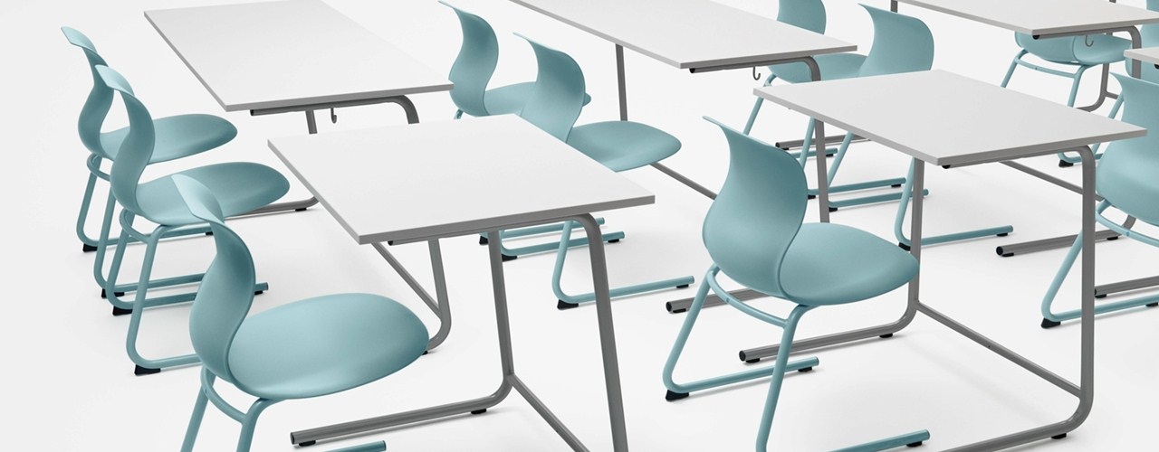 В коллекции представлены модели с подлокотниками, алюминиевыми опорами и разнообразными столешницами, которые подходят для использования в учебных заведениях и частных интерьерах.