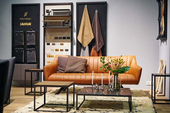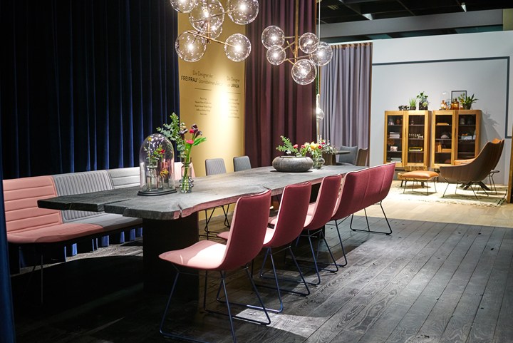 На выставке imm cologne 2018 Freifrau представила новые версии своих коллекций Rubie, Amelie и Marla. Использование бархата, кожи и светлых пород дерева создает атмосферу уюта и роскоши.