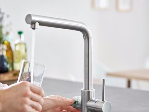 GROHE Blu Home предлагает инновационную систему фильтрации, которая обеспечивает свежую и отфильтрованную воду, снижая необходимость использования пластиковых бутылок и сокращая выбросы CO2.