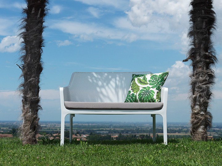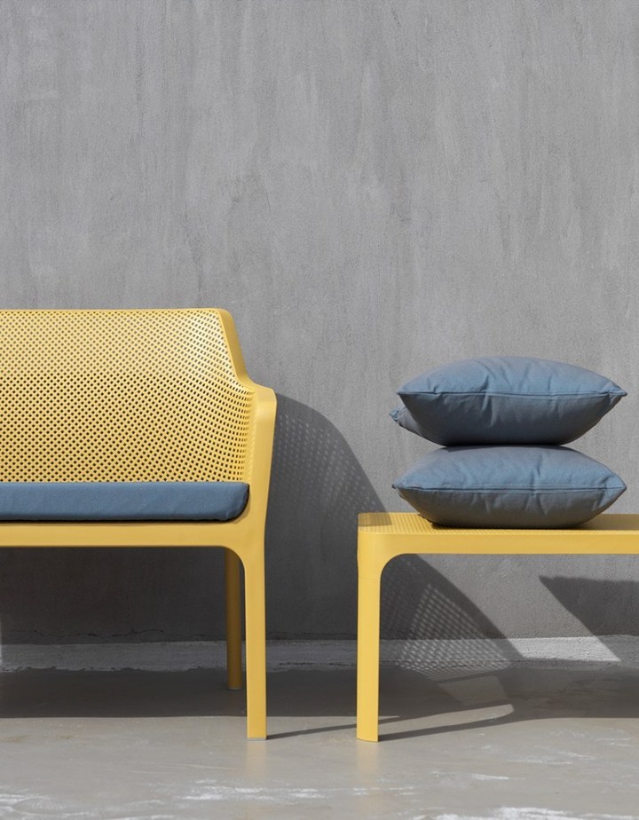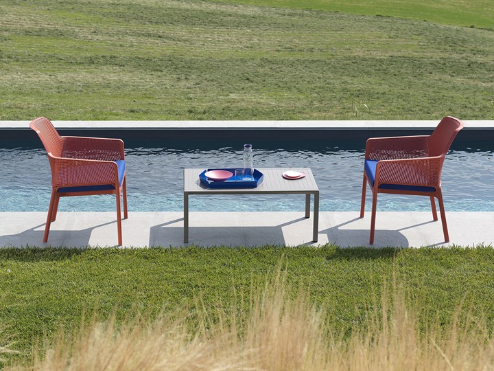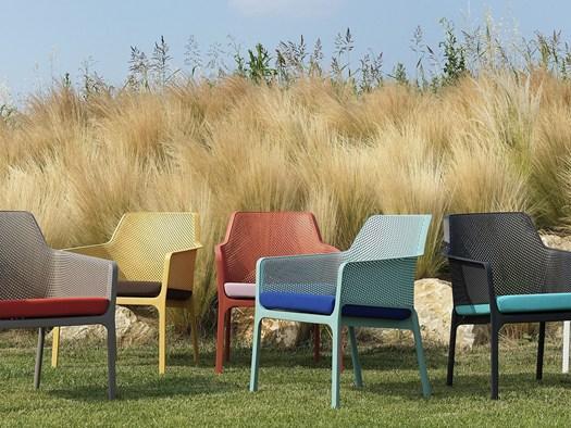 Кресло Net Relax и диван Net Bench представлены в шести изысканных цветах. Стол Net Table дополняет коллекцию, предлагая удобное и функциональное решение для уличных обедов.