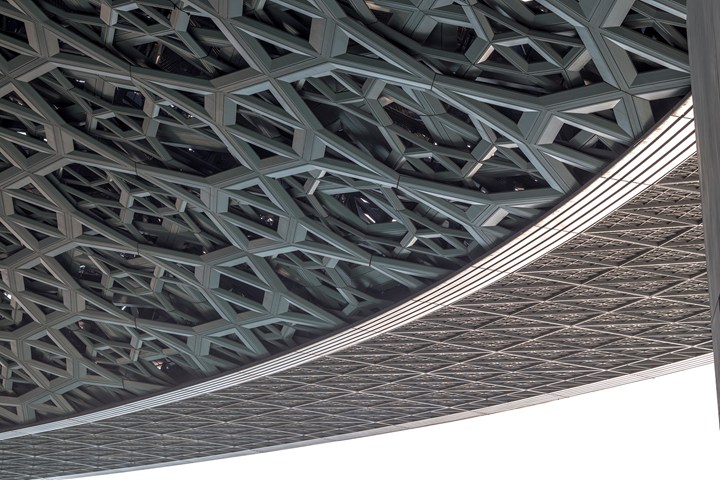 Купол Лувра Абу-Даби состоит из металла, поддерживается четырьмя колоннами и включает около 8,000 звезд различных размеров, создавая эффект игры света и тени.