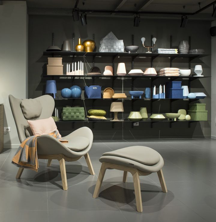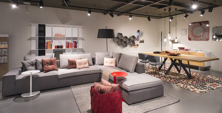 Металлическая лестница и палитра серых тонов создают атмосферу открытости и уюта. Мебель Calligaris подчеркнута в каждом уголке магазина.