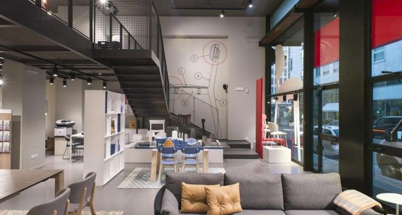 Металлическая лестница и палитра серых тонов создают атмосферу открытости и уюта. Мебель Calligaris подчеркнута в каждом уголке магазина.