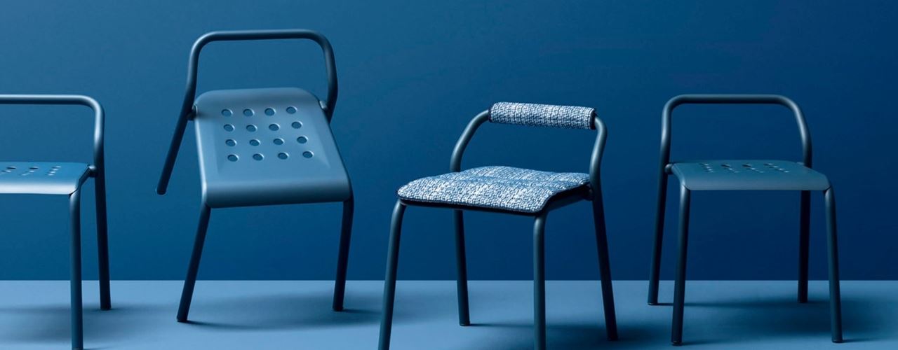 Кресла и табуреты из коллекции Noss отличаются изогнутыми ножками и возможностью штабелирования, что удобно для хранения. Эти модели доступны в девяти цветах, что позволяет выбрать вариант под любой ландшафтный дизайн.