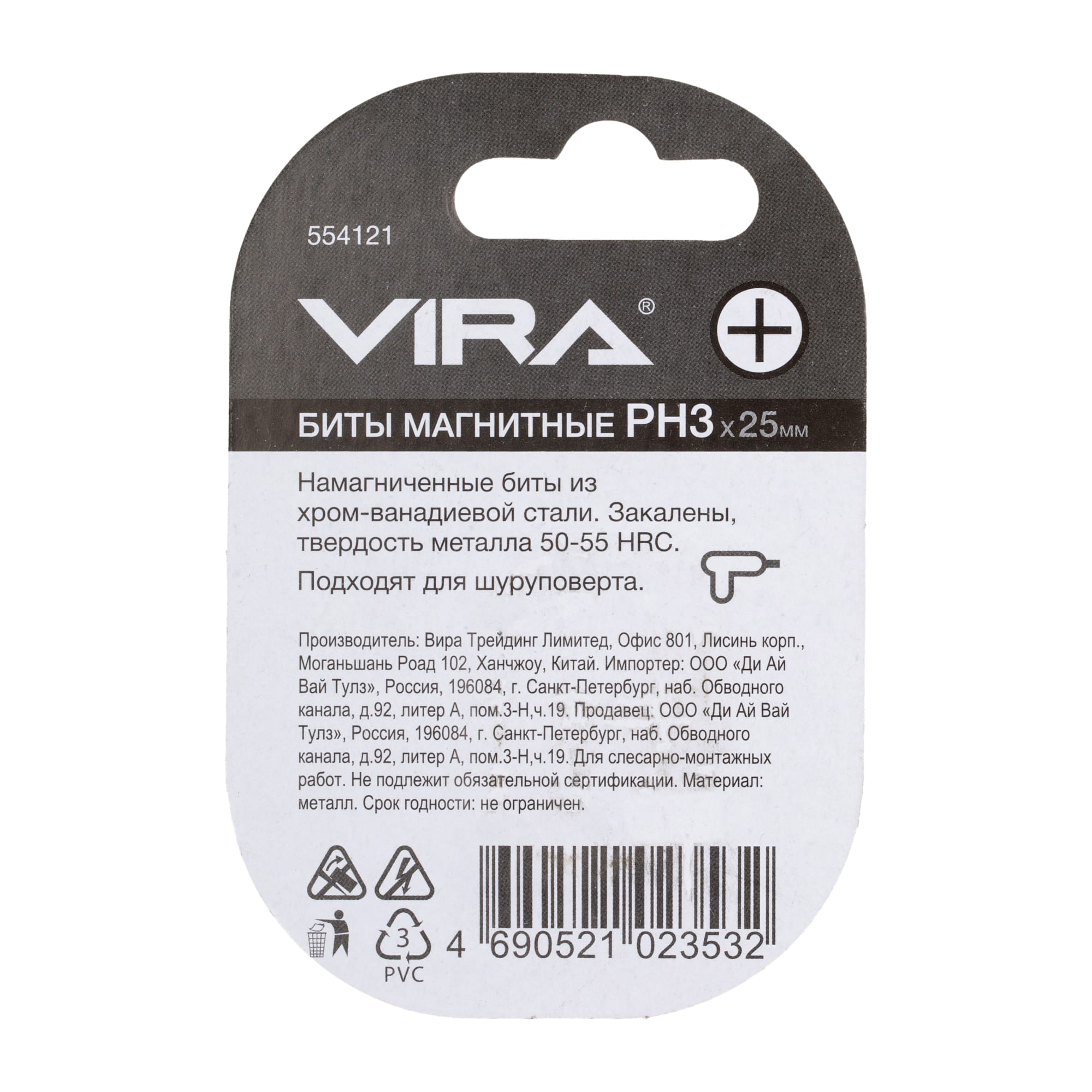 Набор из двух крестовых бит PH3 от VIRA обеспечивает точное и быстрое выполнение монтажных работ. Каждая бита длиной 25 мм оснащена магнитным наконечником для удобства использования.