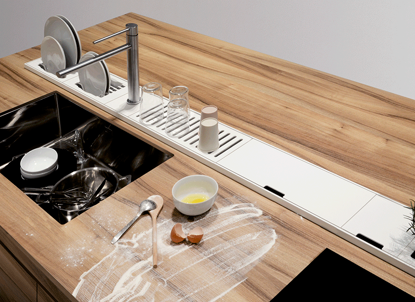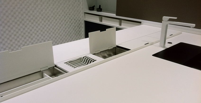 Easyrack Kitchen Flat - это оборудованная канальная система для кухонной поверхности. Он состоит из канала из алюминия и нержавеющей стали, при этом дренажное дно напрямую соединено с дренажной трубой. Easyrack Kitchen Flat используется встраиваемым в кухню, как на стену, так и на остров. Край плоского канала находится заподлицо со столешницей, что обеспечивает минимальное решение. Канал можно дополнить элементами с разными функциями, полезными для кухни; Он доступен в 9 размерах длины от 90 до 210 см, которые сочетаются с модульностью аксессуаров, которые можно свободно вставлять в соответствии с вашими потребностями. Доступны три варианта отделки: белая или черная окраска и анодированная нержавеющая сталь. Аксессуары 15, 30, 45 или 60 см изготовлены из нержавеющей стали с алюминиевой крышкой того же цвета, что и канал; интерьеры выполнены из кориана.