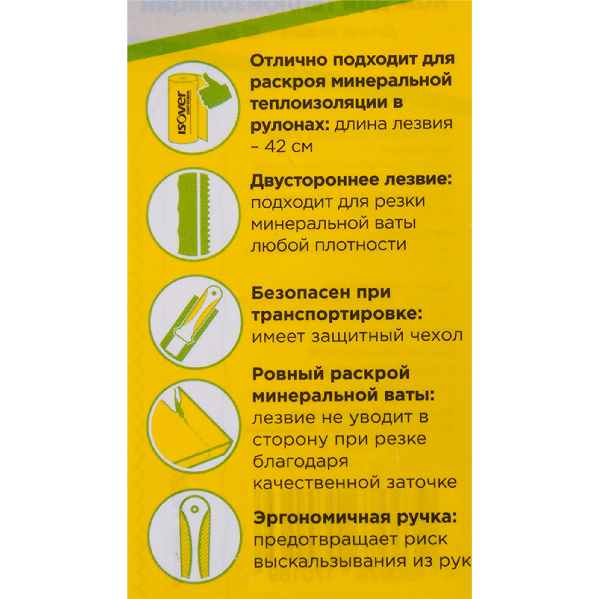 Специализированный нож от ISOVER разработан для эффективной работы с рулонными и плитными теплоизоляционными материалами. Длинное лезвие обеспечивает аккуратный срез по всей толщине материала.
