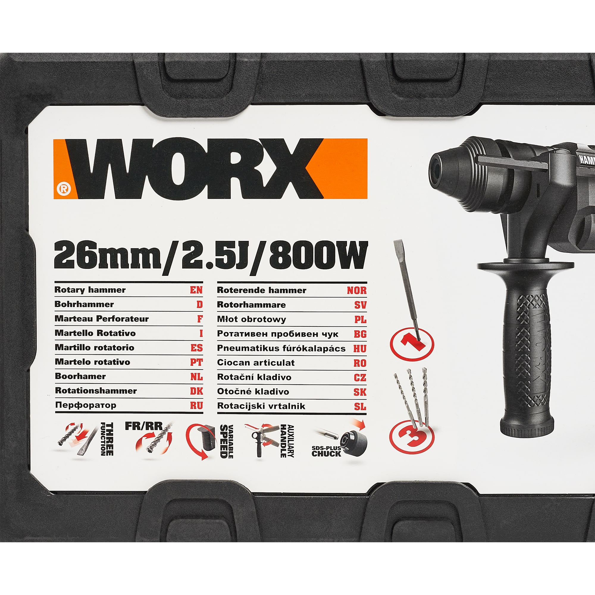 | Аксессуары в комплекте | Комплектация, Перфоратор WORX WT343, Дополнительная ручка Ограничитель глубины сверления 3 SDS сверла 1 SDS плоское зубило Пластиковый бокс |
