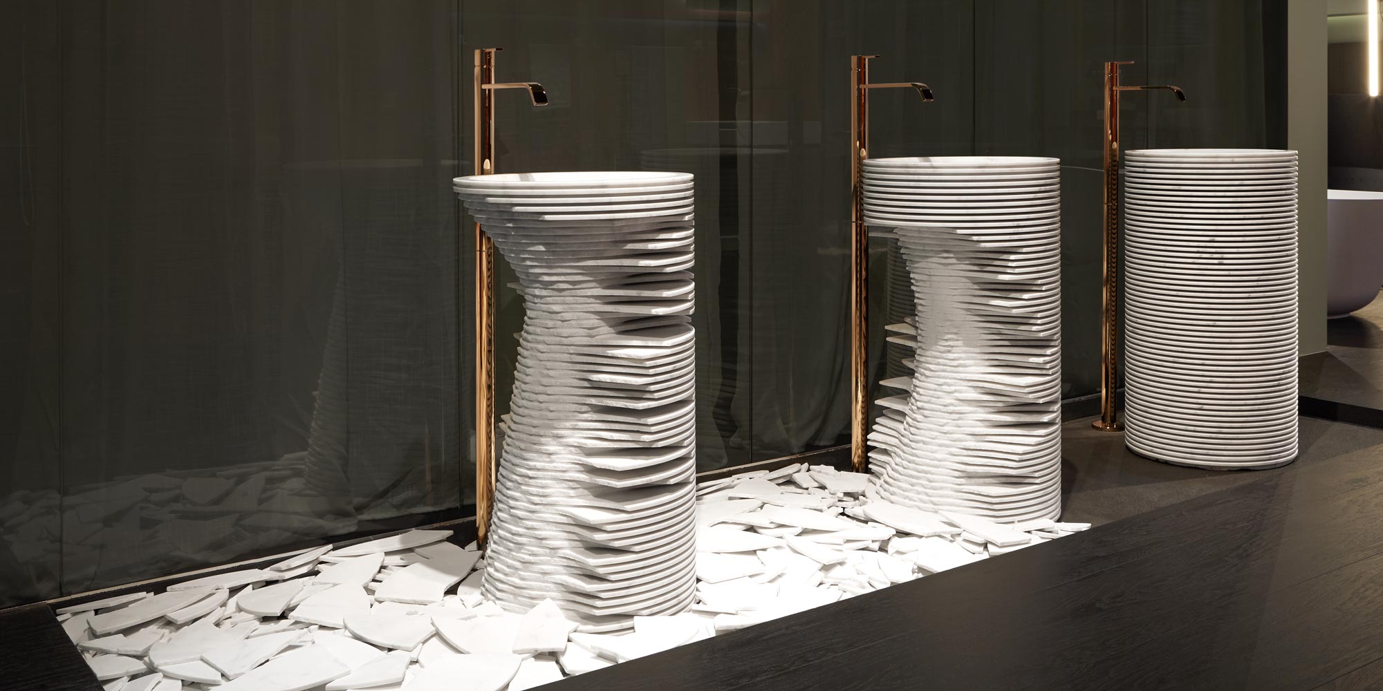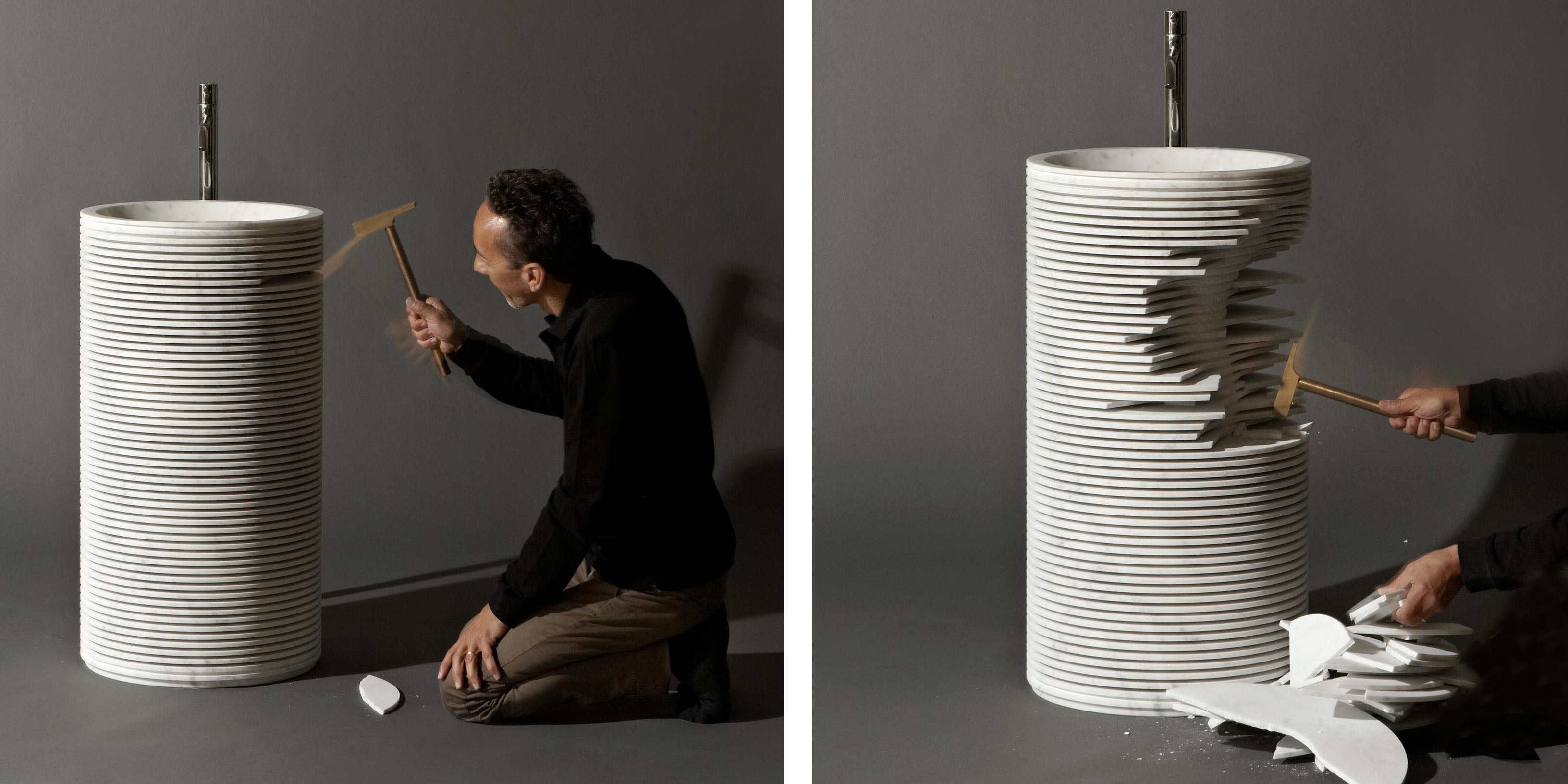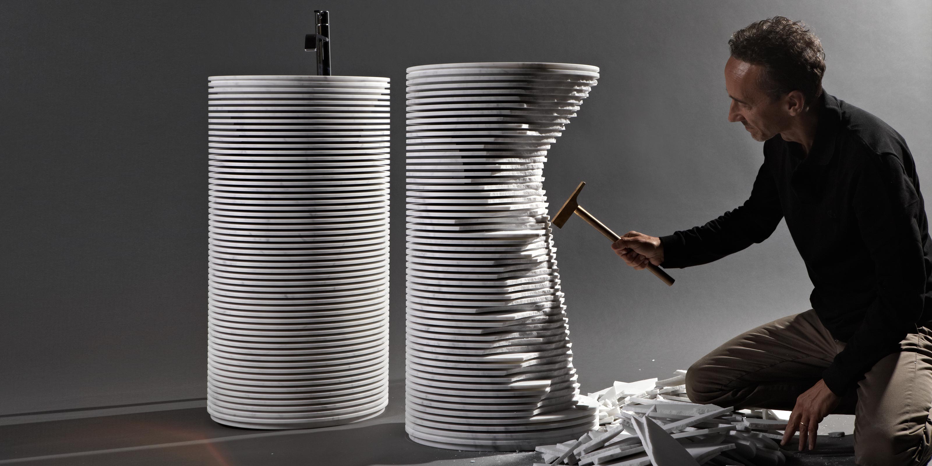 Форма внутри формы была идеей, которая с самого начала сопровождала проект Паоло Ульяна для antoniolupi. Проект, рожденный путем наблюдения за первым черновым наброском на машине мраморных скульптур, в которых трехмерная форма очерчена регулярной серией. резки, обрабатываемой станком с числовым программным управлением. & nbsp; Формируются тонкие полосы мрамора, внешние края которых, когда-то сломанные, открывают необработанную скульптуру, скрытую внутри. Та же концепция и процесс используются при реализации мойки Introverso: белый каррарский мрамор блок, обработанный и облегченный серией разрезов, которые раскрывают его внутреннюю сердцевину, форму внутри формы. Мраморный блок теряет свой монолитный вид и превращается во что-то неземное, прозрачное, заключающее в себе главный секрет. & Nbsp; Душа, которая может оставаться скрытой, оставляя проблеск тонкой игры света, или ее можно медленно раскрыть, сломав края лезвий.