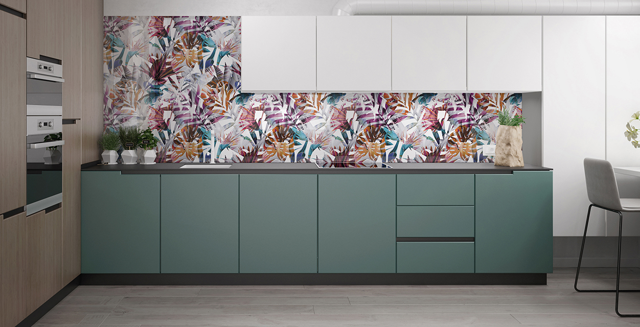 Стекло зеркалит, визуально увеличивая размеры помещения, расширяя пространство. Это ключевой момент в дизайне малогабаритных кухонь и дополнительный плюс в оформлении больших просторных помещений.