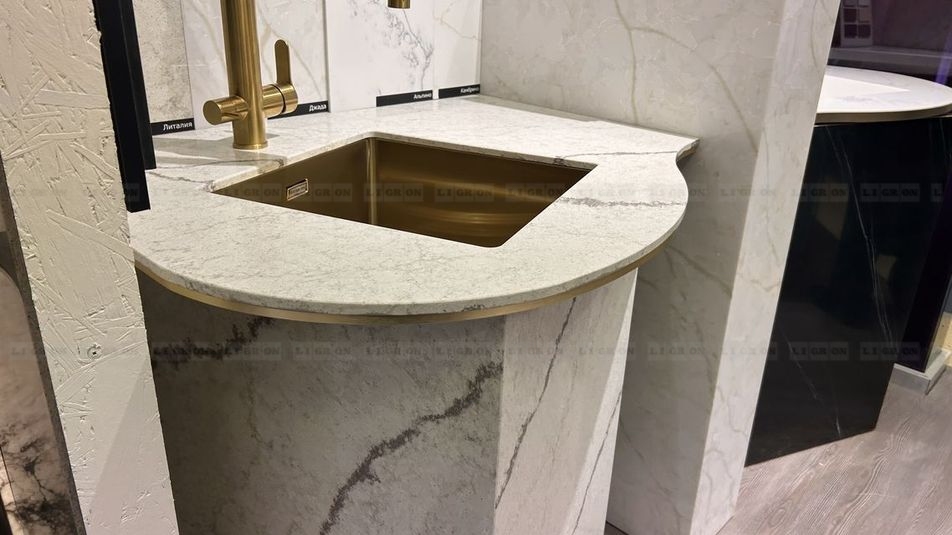 Поэтому имеются ограничения на изготовление столешниц с радиусами. Однако, LIGRON умеет обрабатывать кварцелан и изготавливать из него столешницы и стеновые панели с фигурными классическими профилями.
