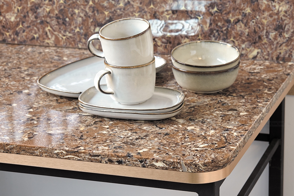 Поэтому имеются ограничения на изготовление столешниц с радиусами. Однако, LIGRON умеет обрабатывать кварцелан и изготавливать из него столешницы и стеновые панели с фигурными классическими профилями.