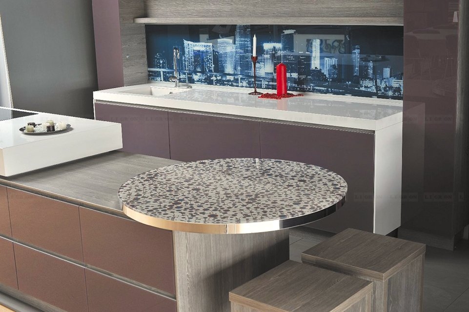 Возможность размещения в зонах сильного нагрева или непосредственно за газовой варочной поверхностью. Лучшая альтернатива неустойчивым к сильному нагреву материалам, таким как искусственный камень.
