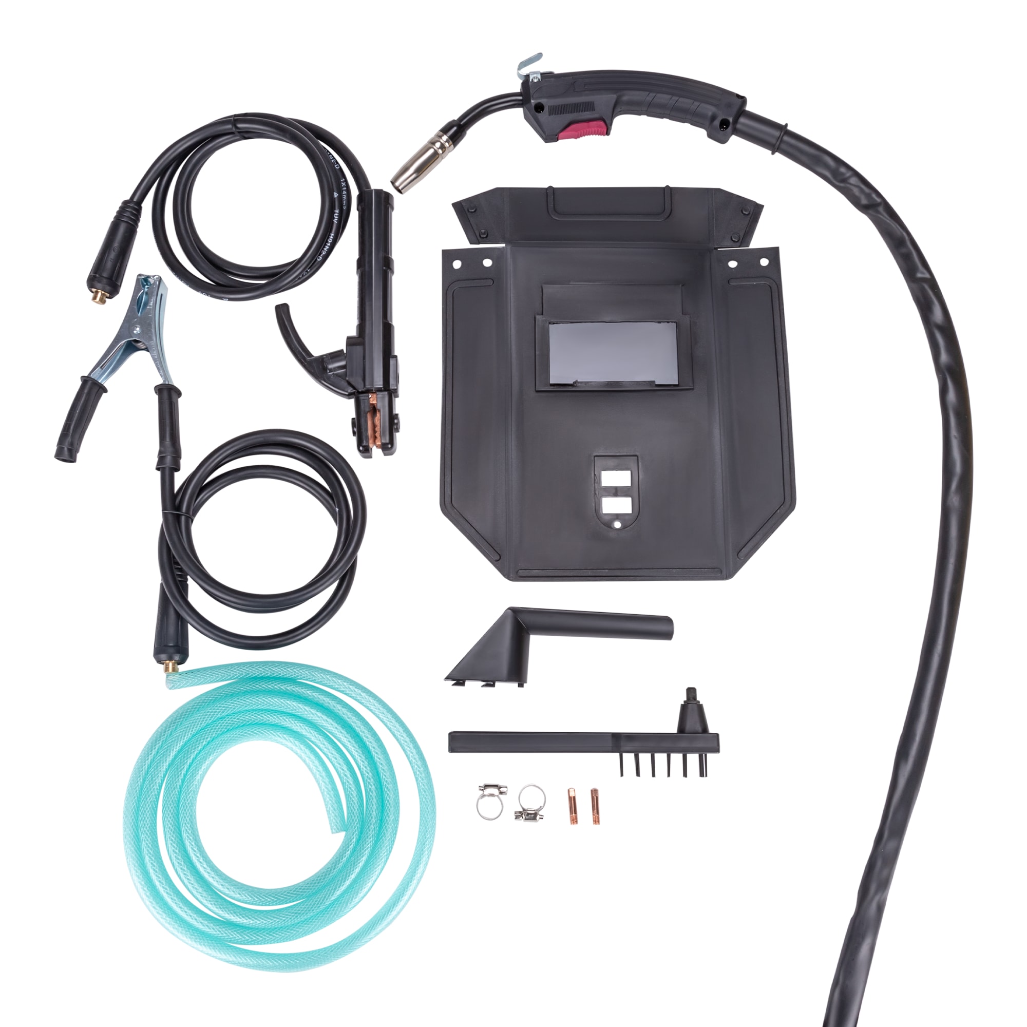 | Аксессуары в комплекте | Горелка MIG с кабелем 2м, электрододержатель 200А с кабелем 1,6м, сечение 14мм2, обратный кабель( масса) 200А 1,3м кабель, сечение 14мм2, газовый шланг 2м, контактные наконечник 0,8мм x2, маска, щетка, хомут для шланга x2, руководство, гарантийный талон. |