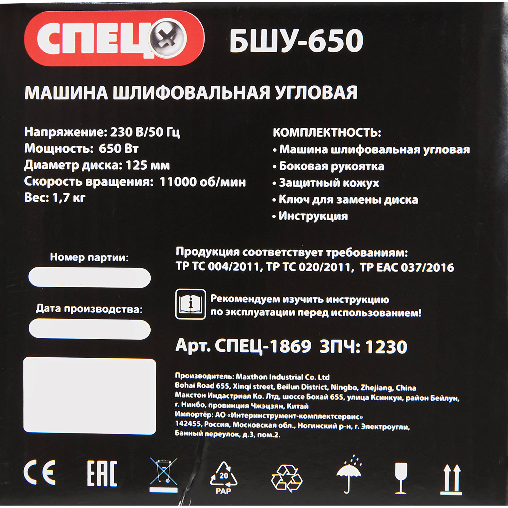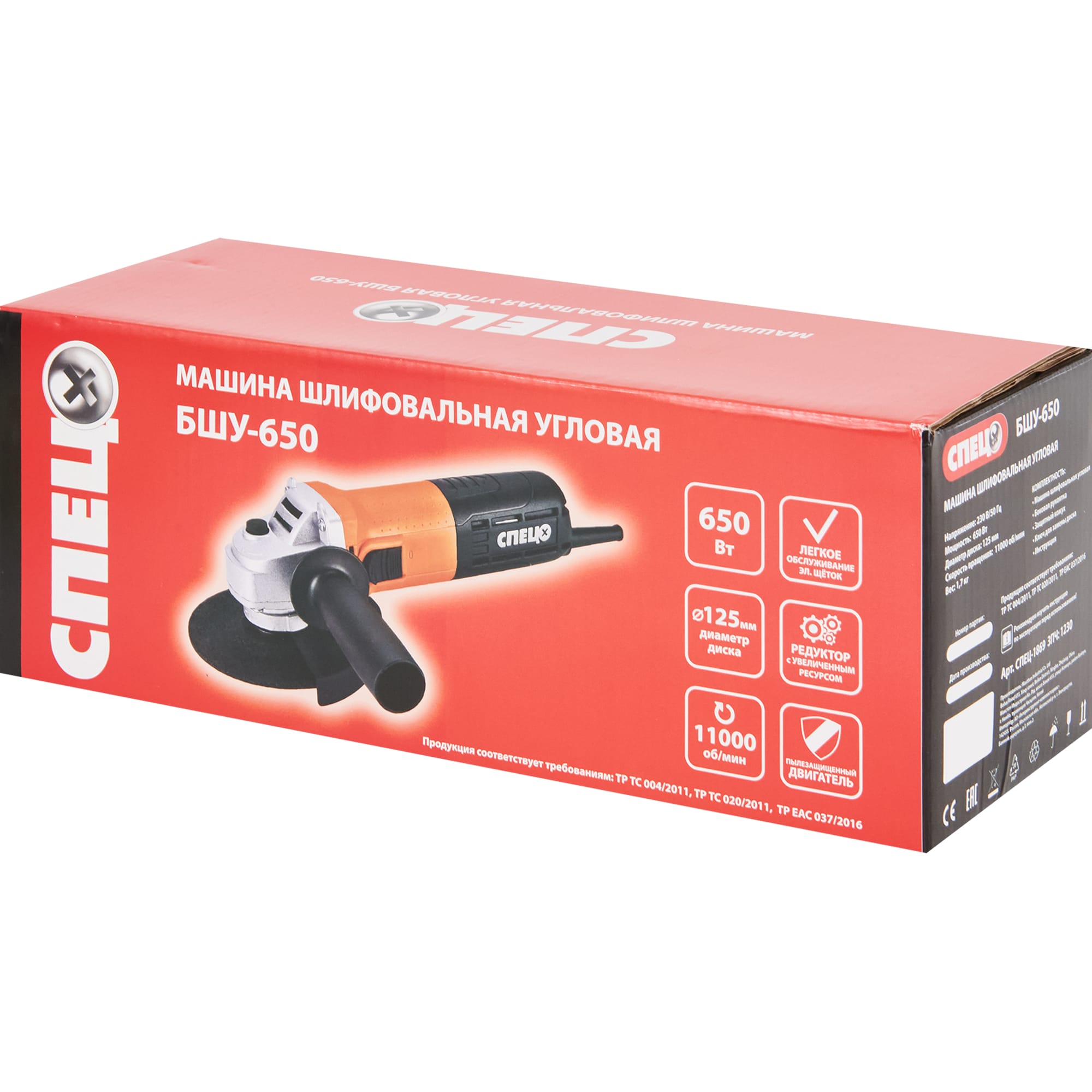 Угловая шлифмашина СПЕЦ БШУ-650 для профессиональных работ 82245642 STLM-0022967 предоставляется с гарантией 12 месяцев с момента покупки.